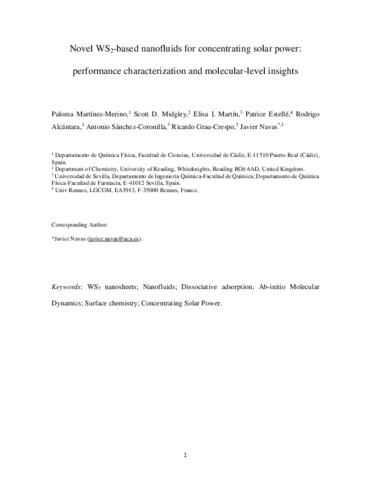 MartÍnez-Merino, P., Midgley, S. D., MartÍn, E. I., EstellÍ, P., Alcántara, R., Sánchez-Coronilla, A., Grau-Crespo, R. orcid id iconORCID: https://orcid.org/0000-0001-8845-1719 and Navas, J. (2020) Novel WS2-based nanofluids for concentrating solar power: performance characterization and molecular-level insights. ACS Applied Materials & Interfaces, 12 (5). pp. 5793-5804. ISSN 1944-8244 doi: 10.1021/acsami.9b18868