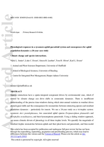 Phenological responses in a sycamore‐aphid‐parasitoid system and consequences for aphid population dynamics: a 20‐year case study.
