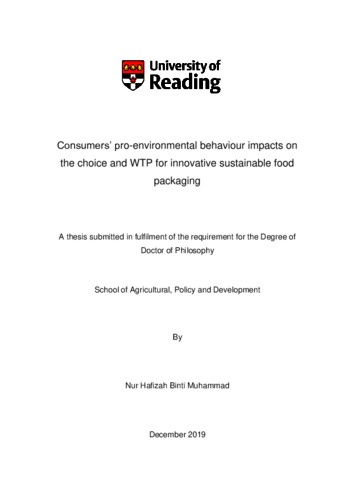 Muhammad, N. H. B. (2019) Consumers’ pro-environmental behaviour impacts on the choice and WTP for innovative sustainable food packaging. PhD thesis, University of Reading. doi: 10.48683/1926.00088937
