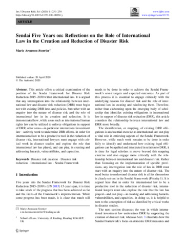 Sendai five years on: reflections on the role of international law in the creation and reduction of disaster risk.