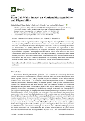 Holland, C., Ryden, P., Edwards, C. H. and Grundy, M. M.-L. (2020) Plant cell walls: impact on nutrient bioaccessibility and digestibility. Foods, 9 (2). e201. ISSN 2304-8158 doi: 10.3390/foods9020201