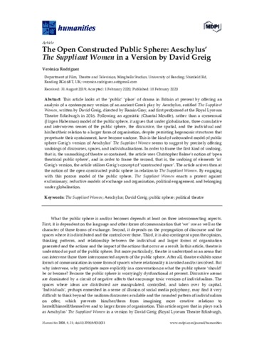 Rodriguez, V. (2020) The open constructed public sphere: Aeschylus’ The Suppliant Women in a version by David Greig. Humanities, 9 (1). 21. ISSN 2076-0787 doi: 10.3390/h9010021