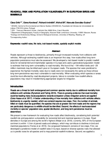 Roads represent a threat to biodiversity, primarily through increased mortality from collisions with vehicles. Although estimating roadkill rates is an important first step, how roads affect long-term population persistence must also be assessed. We developed a trait-based model to predict roadkill rates for terrestrial bird and mammalian species in Europe and used a generalized population model to estimate their long-term vulnerability to road mortality. We found that ~194 million birds and ~29 million mammals may be killed each year on European roads. The species that were predicted to experience the highest mortality rates due to roads were not necessarily the same as those whose long-term persistence was most vulnerable to road mortality. When evaluating which species or areas could be most affected by road development projects, failure to consider how roadkill affects populations may result in misidentifying appropriate targets for mitigation.
