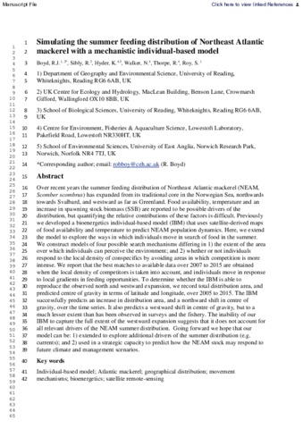 Boyd, R.J., Sibly, R. orcid id iconORCID: https://orcid.org/0000-0001-6828-3543, Hyder, K., Walker, N., Thorpe, R. and Roy, S. orcid id iconORCID: https://orcid.org/0000-0003-2543-924X (2020) Simulating the summer feeding distribution of Northeast Atlantic mackerel with a mechanistic individual-based model. Progress in Oceanography, 183. 102299. ISSN 0079-6611 doi: 10.1016/j.pocean.2020.102299