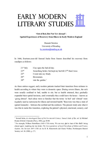 Newton, H. (2020) ‘Out of bed, but not yet abroad’: spatial experiences of recovery from illness in Early Modern England. Early Modern Literary Studies (29). ISSN 1201-2459 (Special Issue: Door Bolts, Thresholds, and Peep-Holes: Liminality and Domestic Spaces in Early Modern England. Edited by Robert Daniel and Iman Sheeha)