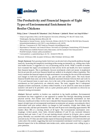 The productivity and financial impacts of eight types of environmental enrichment for broiler chickens.