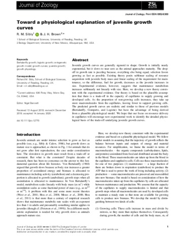 Juvenile growth curves are generally sigmoid in shape: Growth is initially nearly exponential, but it slows to near zero as the animal approaches maturity. The drop‐off in growth rate is puzzling because, everything else being equal, selection favors growing as fast as possible. Existing theory posits sublinear scaling of resource acquisition with juvenile body mass and linear scaling of the requirement for maintenance, so the difference, fuel for growth, decreases as the juvenile increases in size. Experimental evidence, however, suggests that maintenance metabolism increases sublinearly not linearly with size. Here, we develop a new theory consistent with the experimental evidence. Our theory is based on the plausible assumption that there is a trade‐off in the capacity of capillaries to supply growing and developed cells. As the proportion of non‐growing cells increases, they take up more macromolecules from the capillaries, leaving fewer to support growing cells. The predicted growth curves are realistic and similar to those of previous models (Bertalanffy, Gompertz, and Logistic) but have the advantage of being derived from a plausible physiological model. We hope that our focus on resource delivery in capillaries will encourage new experimental work to identify the detailed physiological basis of the trade‐off underlying juvenile growth curves.