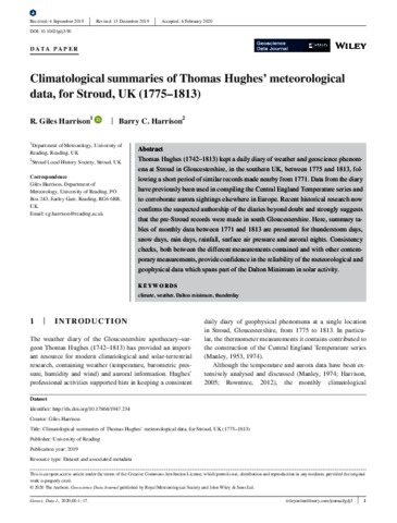 Harrison, R. G. orcid id iconORCID: https://orcid.org/0000-0003-0693-347X and Harrison, B. C. (2020) Climatological summaries of Thomas Hughes’ meteorological data, for Stroud, UK (1775-1813). Geoscience Data Journal, 7 (1). pp. 44-60. ISSN 2049-6060 doi: 10.1002/gdj3.90