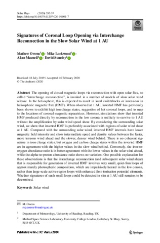 Signatures of coronal loop opening via interchange reconnection in the slow solar wind at 1 AU.