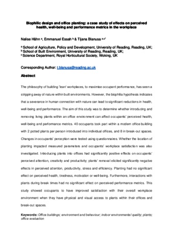 Biophilic design and office planting: a case study of effects on perceived health, well-being and performance metrics in the workplace.