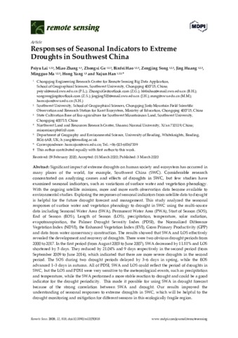 Lai, P., Zhang, M., Ge, Z., Hao, B., Song, Z., Huang, J., Ma, M., Yang, H. orcid id iconORCID: https://orcid.org/0000-0001-9940-8273 and Han, X. (2020) Responses of seasonal indicators to extreme droughts in southwest China. Remote Sensing, 12 (5). 818. ISSN 2072-4292 doi: 10.3390/rs12050818