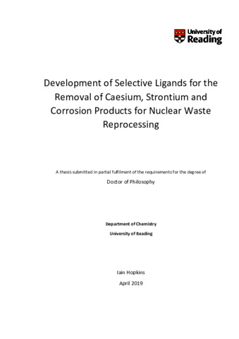 Hopkins, I. (2020) Development of selective ligands for the removal of Caesium, Strontium and corrosion products for nuclear waste reprocessing. PhD thesis, University of Reading. doi: 10.48683/1926.00089369