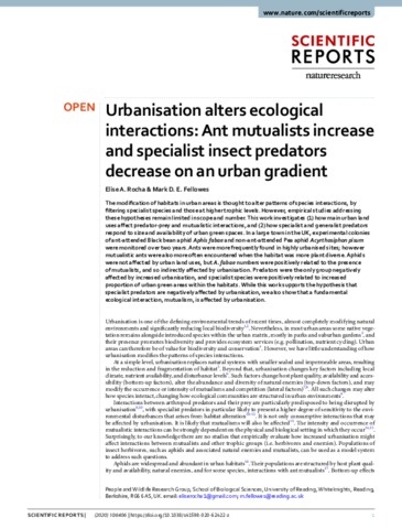 Rocha, E., A. and Fellowes, M. D. E. orcid id iconORCID: https://orcid.org/0000-0001-5431-8637 (2020) Urbanisation alters ecological interactions: ant mutualists increase and specialist insect predators decrease on an urban gradient. Scientific Reports, 10. 6406. ISSN 2045-2322 doi: 10.1038/s41598-020-62422-z