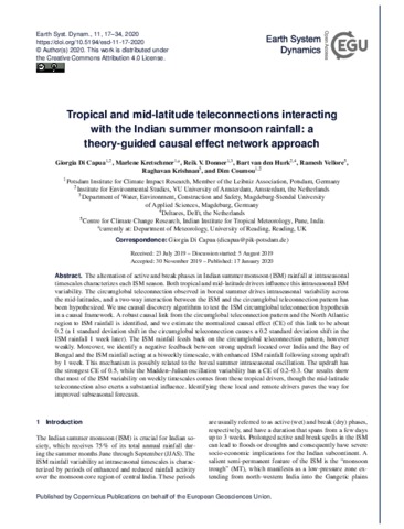 Tropical and mid-latitude teleconnections interacting with the Indian summer monsoon rainfall: a theory-guided causal effect network approach.