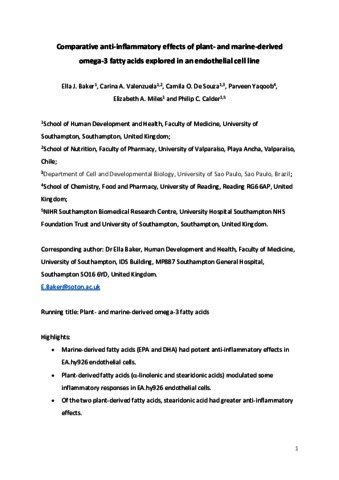 Baker, E. J., Valenzuela, C. A., De Souza, C. O., Yaqoob, P. orcid id iconORCID: https://orcid.org/0000-0002-6716-7599, Miles, E. A. and Calder, P. C. (2020) Comparative anti-inflammatory effects of plant- and marine-derived omega-3 fatty acids explored in an endothelial cell line. Biochimica Et Biophysica Acta - Molecular and Cell Biology of Lipids, 1865 (6). 158662. ISSN 1388-1981 doi: 10.1016/j.bbalip.2020.158662