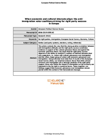 This article contests the view that the strong positive correlation between anti-immigration attitudes and far right party success constitutes evidence in support of the cultural grievance thesis and against the economic grievance thesis. We argue that far right party success depends on the ability to mobilise a coalition of interests between their core supporters, i.e. voters with cultural grievances over immigration and the, often, larger group of voters with economic grievances over immigration. Using individual level data from 8 rounds of the European Social Survey (ESS), our empirical analysis shows that while cultural concerns over immigration are a stronger predictor of far right party support, those who dislike the impact of immigration on the economy are important to the far right in numerical terms. Taken together, our findings suggest that economic grievances over immigration remain pivotal within the context of the transnational cleavage.