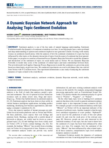 Liang, H., Ganeshbabu, U. and Thorne, T. (2020) A dynamic Bayesian network approach for analysing topic-sentiment evolution. IEEE Access, 8. 54164 -54174. ISSN 2169-3536 doi: 10.1109/ACCESS.2020.2979012