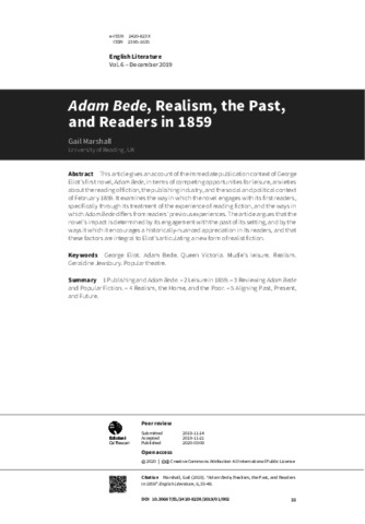 This article gives an account of the immediate publication context of George Eliot’s first novel, Adam Bede, in terms of competing opportunities for leisure, anxieties about the reading of fiction, the publishing industry, and the social and political context of February 1859. It examines the way in which the novel engages with its first readers, specifically through its treatment of the experience of reading fiction, and the ways in which Adam Bede differs from readers’ previous experiences. The article argues that the novel’s impact is determined by its engagement with the past of its setting, and by the ways it which it encourages a historically-nuanced appreciation in its readers, and that these factors are integral to Eliot’s articulating a new form of realist fiction.