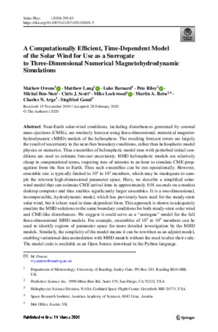 Owens, M. orcid id iconORCID: https://orcid.org/0000-0003-2061-2453, Lang, M. orcid id iconORCID: https://orcid.org/0000-0002-1904-3700, Barnard, L. orcid id iconORCID: https://orcid.org/0000-0001-9876-4612, Riley, P., Ben-Nun, M., Scott, C. J., Lockwood, M. orcid id iconORCID: https://orcid.org/0000-0002-7397-2172, Reiss, M. A., Arge, C. N. and Gonzi, S. (2020) A computationally efficient, time-dependent model of the solar wind for use as a surrogate to three-dimensional numerical magnetohydrodynamic simulations. Solar Physics, 295 (3). 43. ISSN 0038-0938 doi: 10.1007/s11207-020-01605-3