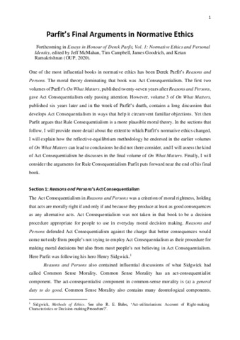 Hooker, B. (2021) Parfit's final arguments in normative ethics. In: McMahan, J., Campbell, T., Goodrich, J. and Ramakrishnan, K. (eds.) Principles and Persons: The Legacy of Derek Parfit. Oxford University Press, Oxford, viii, 479 pages. ISBN 9780192893994 doi: 10.1093/oso/9780192893994.003.0010