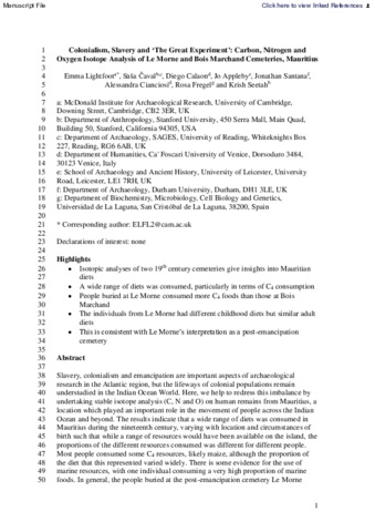 Colonialism, slavery and ‘The Great Experiment’: carbon, nitrogen and oxygen isotope analysis of Le Morne and Bois Marchand cemeteries, Mauritius.