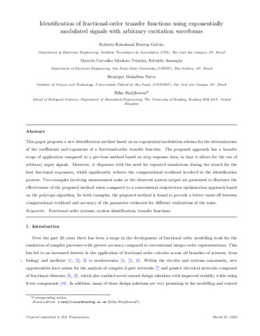 Galvão, R. K. H., Tiexeira, M. C. M., Assunção, E., Paiva, H. M. and Hadjiloucas, S. orcid id iconORCID: https://orcid.org/0000-0003-2380-6114 (2020) Identification of fractional-order transfer functions using exponentially modulated signals with arbitrary excitation waveforms. ISA Transactions, 103. pp. 10-18. ISSN 0019-0578 doi: 10.1016/j.isatra.2020.03.027