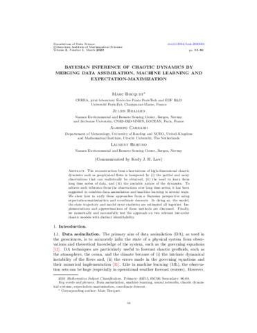 Bocquet, M., Brajard, J., Carrassi, A. orcid id iconORCID: https://orcid.org/0000-0003-0722-5600 and Bertino, L. (2020) Bayesian inference of chaotic dynamics by merging data assimilation, machine learning and expectation-maximization. Foundations of Data Science, 2 (1). pp. 55-80. ISSN 2639-8001 doi: 10.3934/fods.2020004
