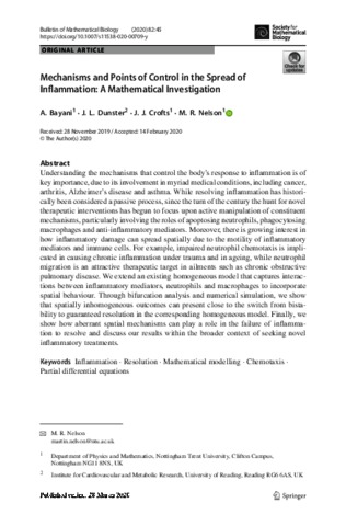 Bayani, A., Dunster, J. L. orcid id iconORCID: https://orcid.org/0000-0001-8986-4902, Crofts, J. J. and Nelson, M. R. (2020) Mechanisms and points of control in the spread of inflammation: a mathematical investigation. Bulletin of Mathematical Biology, 82 (4). 45. ISSN 1522-9602 doi: 10.1007/s11538-020-00709-y
