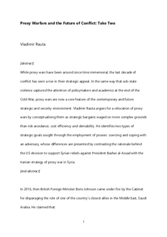 Rauta, V. orcid id iconORCID: https://orcid.org/0000-0003-3870-8680 (2020) Proxy warfare and the future of conflict: take two. RUSI Journal, 165 (2). pp. 1-10. ISSN 1744-0378 doi: 10.1080/03071847.2020.1736437