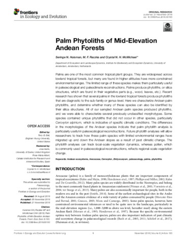 Palms are one of the most common tropical plant groups. They are widespread across lowland tropical forests, but many are found in higher altitudes have more constrained environmental ranges. The limited range of these species makes them particularly useful in paleoecological and paleoclimate reconstructions. Palms produce phytoliths, or silica structures, which are found in their vegetative parts (e.g., wood, leaves, etc.). Recent research has shown that several palms in the lowland tropical forests produce phytoliths that are diagnostic to the sub-family or genus-level. Here we characterize Andean palm phytoliths, and determine whether many of these species can also be identified by their silica structures. All of our sampled Andean palm species produced phytoliths, and we were able to characterize several previously unclassified morphotypes. Some species contained unique phytoliths that did not occur in other species, particularly Ceroxylon alpinium, which is indicative of specific climatic conditions. The differences in the morphologies of the Andean species indicate that palm phytolith analysis is particularly useful in paleoecological reconstructions. Future phytolith analyses will allow researchers to track how these palm species with limited environmental ranges have migrated up and down the Andean slopes as a result of past climatic change. The phytolith analyses can track local-scale vegetation dynamics, whereas pollen, which is commonly used in paleoecological reconstructions, reflects regional-scale vegetation change.