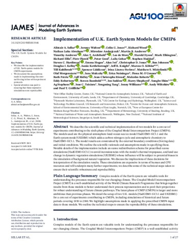 Sellar, A. A., Walton, J., Jones, C. G., Wood, R., Abraham, N. L., Andrejczuk, M., Andrews, M. B., Andrews, T., Archibald, A. T., de Mora, L., Dyson, H., Elkington, M., Ellis, R., Florek, P., Good, P., Gohar, L., Haddad, S., Hardiman, S. C., Hogan, E., Iwi, A., Jones, C. D., Johnson, B., Kelley, D. I., Kettleborough, J., Knight, J. R., Köhler, M. O., Kuhlbrodt, T. orcid id iconORCID: https://orcid.org/0000-0003-2328-6729, Liddicoat, S., Linova‐Pavlova, I., Mizielinski, M. S., Morgenstern, O., Mulcahy, J., Neininger, E., O'Connor, F. M., Petrie, R., Ridley, J., Rioual, J.‐C., Roberts, M., Robertson, E., Rumbold, S. orcid id iconORCID: https://orcid.org/0000-0001-8138-4541, Seddon, J., Shepherd, H., Shim, S., Stephens, A., Teixiera, J. C., Tang, Y., Williams, J., Wiltshire, A. and Griffiths, P. T. (2020) Implementation of U.K. Earth system models for CMIP6. Journal of Advances in Modeling Earth Systems, 12 (4). e2019MS001946. ISSN 1942-2466 doi: 10.1029/2019MS001946