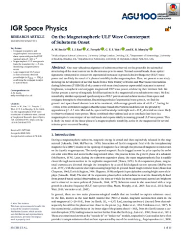 Smith, A. W., Rae, I.J., Forsyth, C., Watt, C. .E. J. and Murphy, K. R. (2020) On the magnetospheric ULF wave counterpart of substorm onset. Journal of Geophysical Research: Space Physics, 125 (4). e2019JA027573. ISSN 2169-9402 doi: 10.1029/2019ja027573