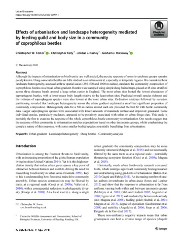 Effects of urbanisation and landscape heterogeneity mediated by feeding guild and body size in a community of coprophilous beetles.