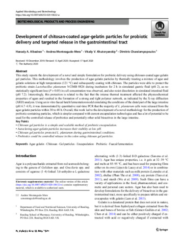 Albadran, H. A., Monteagudo-Mera, A., Khutoryanskiy, V. V. orcid id iconORCID: https://orcid.org/0000-0002-7221-2630 and Charalampopoulos, D. orcid id iconORCID: https://orcid.org/0000-0003-1269-8402 (2020) Development of chitosan-coated agar-gelatin particles for probiotic delivery and targeted release in the gastrointestinal tract. Applied Microbiology and Biotechnology, 104 (13). pp. 5749-5757. ISSN 0175-7598 doi: 10.1007/s00253-020-10632-w