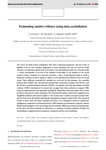 Carrassi, A. orcid id iconORCID: https://orcid.org/0000-0003-0722-5600, Bocquet, M., Hannart, A. and Ghil, M. (2017) Estimating model evidence using data assimilation. Quarterly Journal of the Royal Meteorological Society, 143 (703). pp. 866-880. ISSN 1477-870X doi: 10.1002/qj.2972