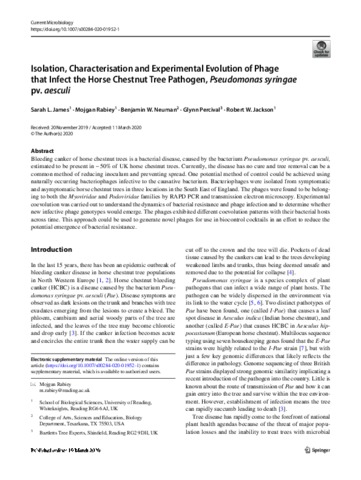James, S. L., Rabiey, M., Neuman, B. W., Percival, G. and Jackson, R. W. (2020) Isolation, characterisation and experimental evolution of phage that infect the horse chestnut tree pathogen, Pseudomonas syringae pv. aesculi. Current Microbiology, 77 (8). pp. 1438-1447. ISSN 0343-8651 doi: 10.1007/s00284-020-01952-1