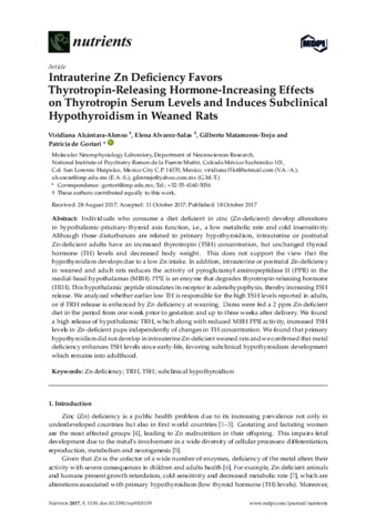 Intrauterine Zn deficiency favors thyrotropin-releasing hormone-increasing effects on thyrotropin serum levels and induces subclinical hypothyroidism in weaned rats.