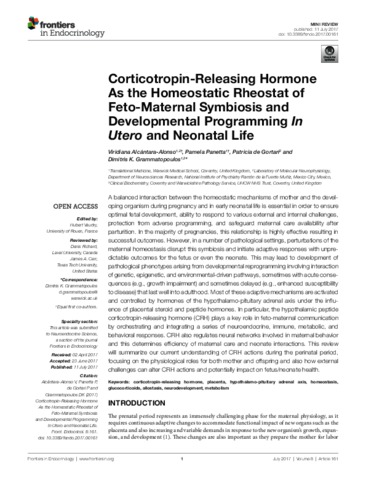 A balanced interaction between the homeostatic mechanisms of mother and the devel- oping organism during pregnancy and in early neonatal life is essential in order to ensure optimal fetal development, ability to respond to various external and internal challenges, protection from adverse programming, and safeguard maternal care availability after parturition. In the majority of pregnancies, this relationship is highly effective resulting in successful outcomes. However, in a number of pathological settings, perturbations of the maternal homeostasis disrupt this symbiosis and initiate adaptive responses with unpre- dictable outcomes for the fetus or even the neonate. This may lead to development of pathological phenotypes arising from developmental reprogramming involving interaction of genetic, epigenetic, and environmental-driven pathways, sometimes with acute conse- quences (e.g., growth impairment) and sometimes delayed (e.g., enhanced susceptibility to disease) that last well into adulthood. Most of these adaptive mechanisms are activated and controlled by hormones of the hypothalamo-pituitary adrenal axis under the influ- ence of placental steroid and peptide hormones. In particular, the hypothalamic peptide corticotropin-releasing hormone (CRH) plays a key role in feto-maternal communication by orchestrating and integrating a series of neuroendocrine, immune, metabolic, and behavioral responses. CRH also regulates neural networks involved in maternal behavior and this determines efficiency of maternal care and neonate interactions. This review will summarize our current understanding of CRH actions during the perinatal period, focusing on the physiological roles for both mother and offspring and also how external challenges can alter CRH actions and potentially impact on fetus/neonate health.