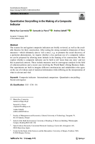 Kuc-Czarnecka, M., Lo Piano, S. orcid id iconORCID: https://orcid.org/0000-0002-2625-483X and Saltelli, A. (2020) Quantitative storytelling in the making of a composite indicator. Social Indicators Research, 149 (3). pp. 775-802. ISSN 1573-0921 doi: 10.1007/s11205-020-02276-0