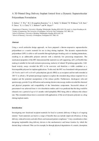 Using a novel molecular design approach, we have prepared a thermo-responsive supramolecular polyurethane as a matrix material for use in drug eluting implants. The dynamic supramolecular polyurethane (SPU) is able to self-assemble through hydrogen bonding and π-π stacking interactions, resulting in an addressable polymer network with a relatively low processing temperature. The mechanical properties of the SPU demonstrated the material was self-supporting, stiff, yet flexible thus making it suitable for hot-melt extrusion processing, inclusive of related 3D printing approaches. Cell-based toxicity assays revealed the SPU to be non-toxic and therefore a viable candidate as a biocompatible polymer for implant applications. To this end, the SPU was formulated with paracetamol (16 %w/w) and 4 wt% or 8 wt% poly(ethylene glycol) (PEG) as an excipient and hot melt extruded at 100 °C to afford a 3D printed prototype implant to explore the extended drug release required for an implant and the potential manipulation of the release profile. Furthermore, rheological, infra-red spectroscopy, powder X-ray diffraction and scanning electron microscopy studies revealed the chemical and physical properties and compatibility of the formulation components. Successful release of paracetamol was achieved from in vitro dissolution studies and it was predicted that the drug would be released over a period of up to 8.5 months with hydrophilic PEG being able to influence the release rate. This extended release time is consistent with applications of this novel dynamic polymer as a drug eluting implant matrix.