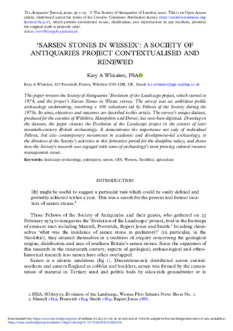 Whitaker, K. A. (2020) 'Sarsen stones in Wessex': a society of antiquaries project contextualised and renewed. Antiquaries Journal, 100. pp. 432-456. ISSN 1758-5309 doi: 10.1017/S0003581520000256