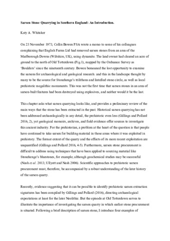 Whitaker, K. A. (2019) Sarsen stone quarrying in southern England: an introduction. In: Teather, A., Topping, P. and Baczkowski, J. (eds.) Mining an Quarrying in Neolithic Europe: A Social Perspective. Neolithic Studies Group Seminar Papers, 16. Oxbow Books. ISBN 9781789251487 doi: 10.2307/j.ctvkjb2v8