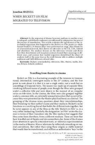 In the migration of drama from one medium to another a text is reshaped, and different audiences are addressed by adaptations because of the process of remediation. This article evaluates the significance of the intermedial migrations that happened to the "Beckett on Film" project in which Samuel Beckett’s 19 theatre plays were performed on stage, then filmed for an international festival, then shown on television in the UK, USA, Ireland and elsewhere. The analysis focuses on the television versions and shows how their distribution and reception contexts framed their meanings in different ways, and assesses how medial migration destabilised the object of analysis itself at the same time as the work became able to address multiple audiences and fulfil different cultural roles.