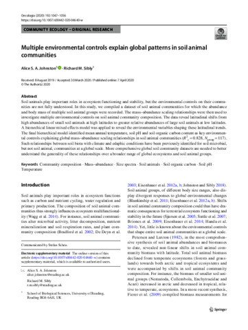 Soil animals play important roles in ecosystem functioning and stability, but the environmental controls on their communities are not fully understood. In this study, we compiled a dataset of soil animal communities for which the abundance and body mass of multiple soil animal groups were recorded. The mass–abundance scaling relationships were then used to investigate multiple environmental controls on soil animal community composition. The data reveal latitudinal shifts from high abundances of small soil animals at high latitudes to greater relative abundances of large soil animals at low latitudes. A hierarchical linear mixed effects model was applied to reveal the environmental variables shaping these latitudinal trends. The final hierarchical model identified mean annual temperature, soil pH and soil organic carbon content as key environmental controls explaining global mass–abundance scaling relationships in soil animal communities (R2c = 0.828, Ngroup = 117). Such relationships between soil biota with climate and edaphic conditions have been previously identified for soil microbial, but not soil animal, communities at a global scale. More comprehensive global soil community datasets are needed to better understand the generality of these relationships over a broader range of global ecosystems and soil animal groups.