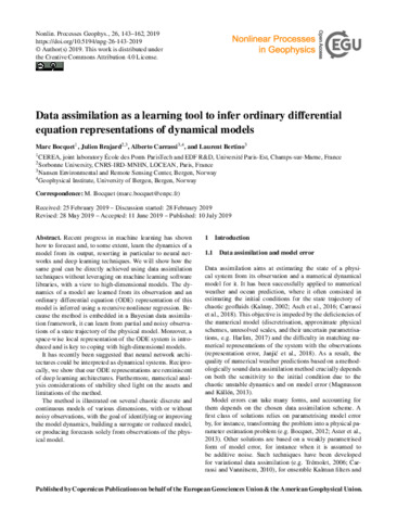 Bocquet, M., Brajard, J., Carrassi, A. orcid id iconORCID: https://orcid.org/0000-0003-0722-5600 and Bertino, L. (2019) Data assimilation as a learning tool to infer ordinary differential equation representations of dynamical models. Nonlinear Processes in Geophysics, 26 (3). pp. 143-162. ISSN 1607-7946 doi: 10.5194/npg-26-143-2019