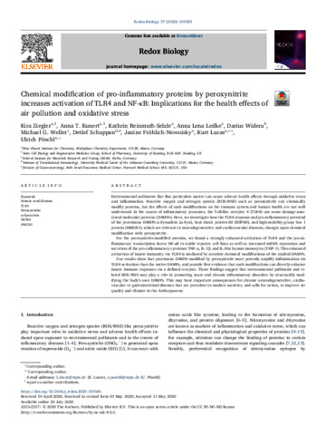 Chemical modification of pro-inflammatory proteins by peroxynitrite increases activation of TLR4 and NF-κB: implications for the health effects of air pollution and oxidative stress.