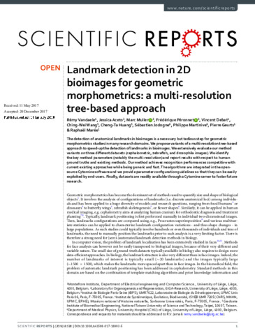Vandaele, R., Aceto, J., Muller, M., Péronnet, F., Debat, V., Wang, C.-W., Huang, C.-T., Jodogne, S., Martineve, P., Geurts, P. and Marée, R. (2018) Landmark detection in 2D bioimages for geometric morphometrics: a multi-resolution tree-based approach. Scientific Reports, 8 (1). 538. ISSN 2045-2322 doi: 10.1038/s41598-017-18993-5