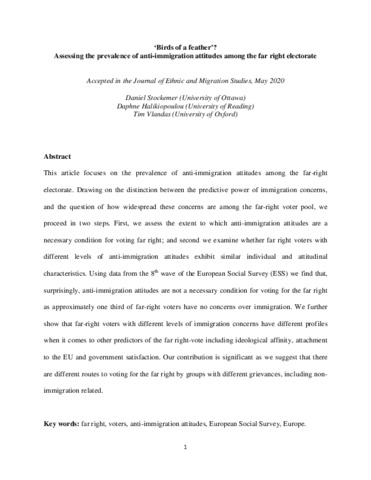 Stockemer, D., Halikiopoulou, D. and Vlandas, T. (2021) ‘Birds of a feather’? Assessing the prevalence of anti-immigration attitudes among the far right electorate. Journal of Ethnic and Migration Studies, 47 (15). pp. 3409-3436. ISSN 1369-183X doi: 10.1080/1369183X.2020.1770063