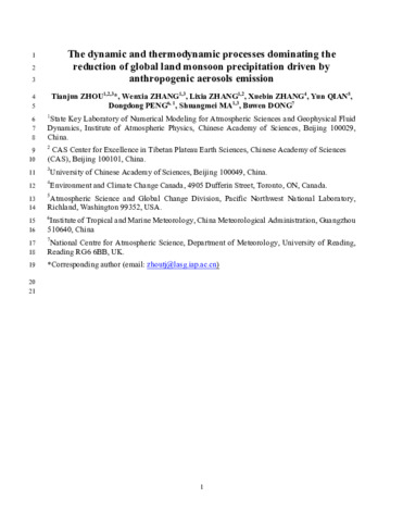 Zhou, T., Zhang, W., Zhang, L., Zhang, X., Qian, Y., Peng, D., Ma, S. and Dong, B. orcid id iconORCID: https://orcid.org/0000-0003-0809-7911 (2020) The dynamic and thermodynamic processes dominating the reduction of global land monsoon precipitation driven by anthropogenic aerosols emission. Science China Earth Sciences, 63 (7). pp. 919-933. ISSN 1869-1897 doi: 10.1007/s11430-019-9613-9