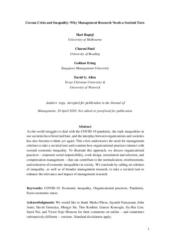 Bapuji, H., Patel, C., Ertug, G. and Allen, D. G. (2020) Corona crisis and inequality: why management research needs a societal turn. Journal of Management, 46 (7). pp. 1205-1222. ISSN 1557-1211 doi: 10.1177/0149206320925881